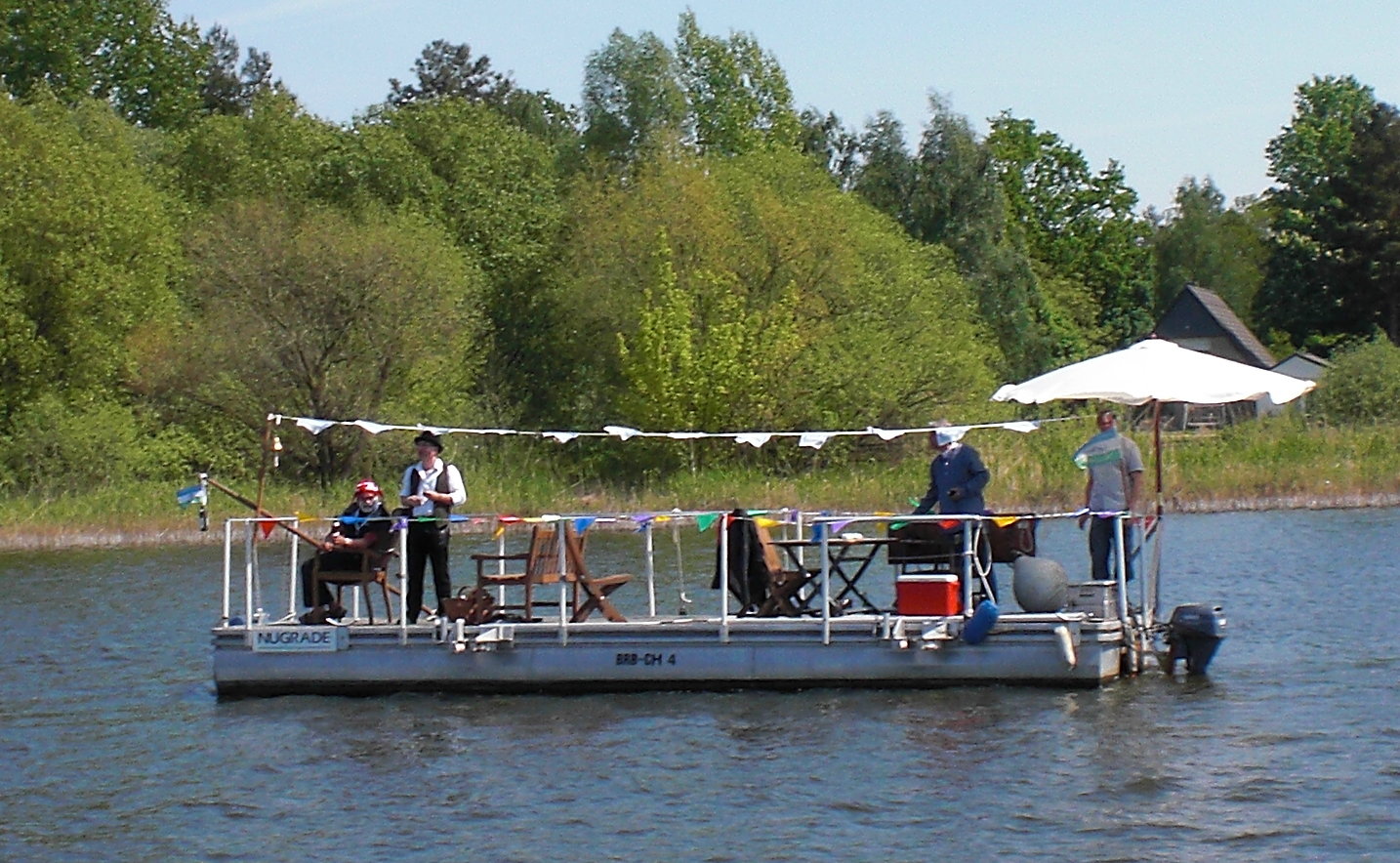 Begleitet wurden die Boote vom Wasserschutz, dem Techn. Hilfswerk und der DLRG. Zu allem sang der Shanty-Chor, der sich auf der „Aufbau“ in den Korso eingereiht hatte. Viele Schaulustige waren an den Ufern und winkten den Schiffen zu. Auf einer Plattform im See erwartete ein Friseur mit Pinsel und Rasiermesser bewaffnet und mit einem historischen Friseurstuhl als Fritze Bollmann seine Kundschaft.