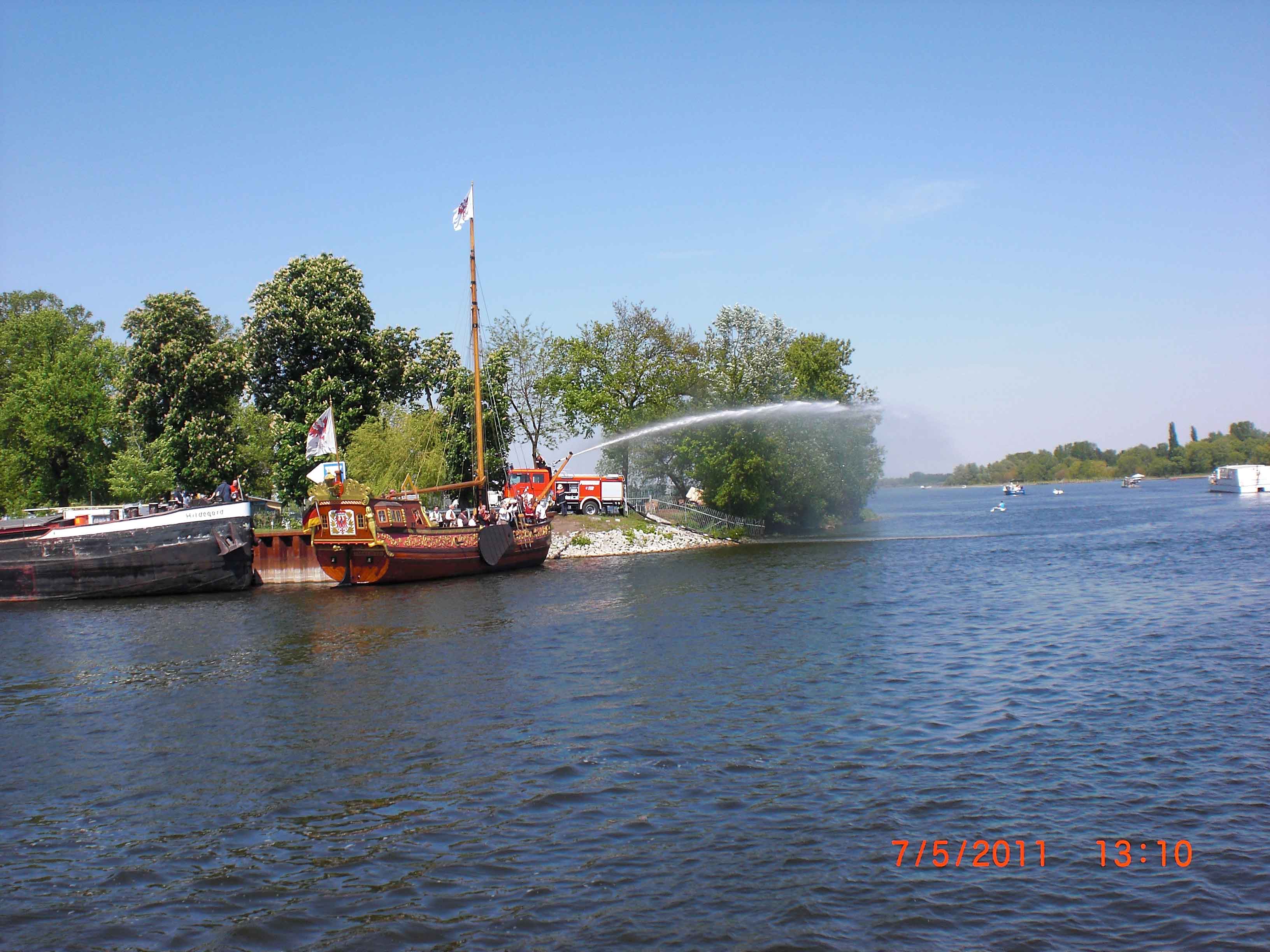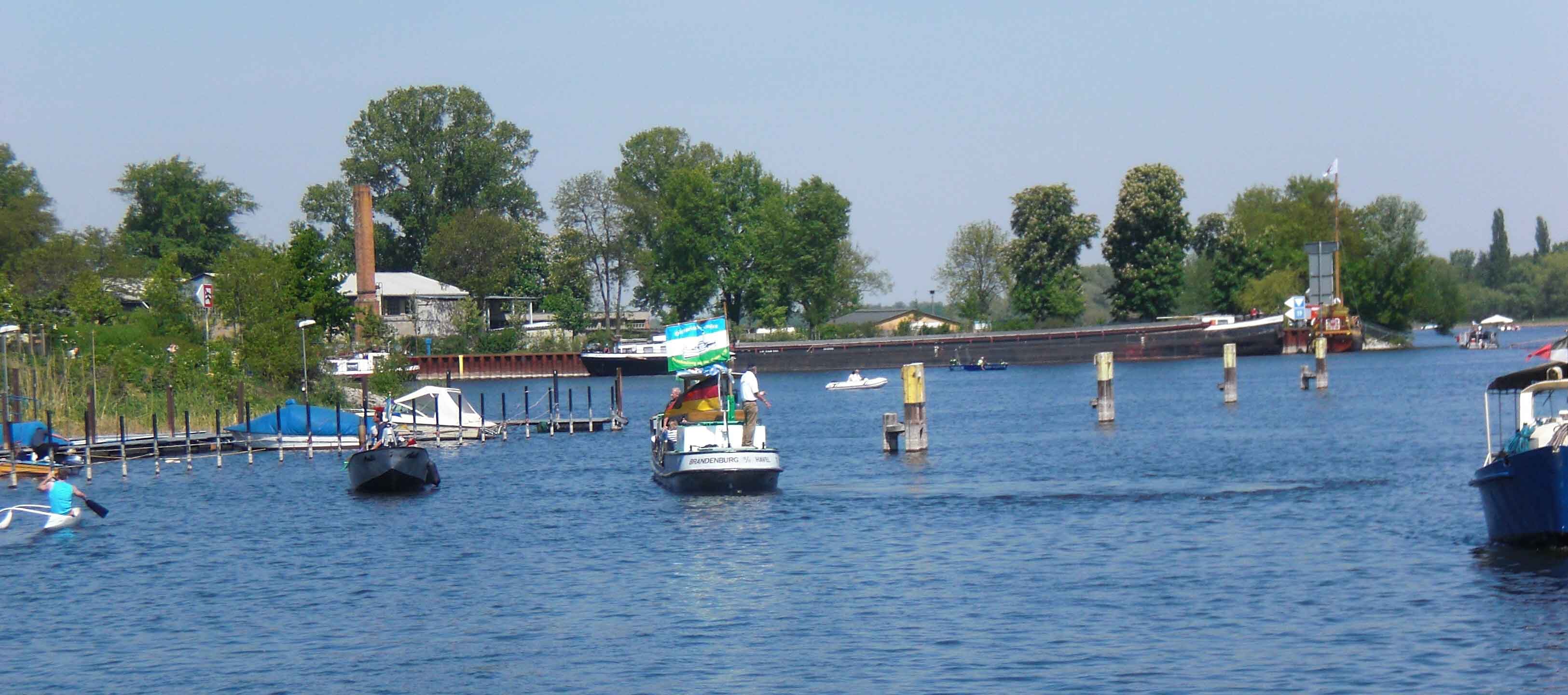 Der Verein „Historischer Hafen Brandenburg an der Havel e. V.“ hatte zu einem Boots-Korso zur Erinnerung an Fritze Bollmann eingeladen. Petrus hatte sicher Angst, Bollmann könnte doch bei schlechtem Wetter wieder oben auftauchen und schickte uns herrlichen Sonnenschein.